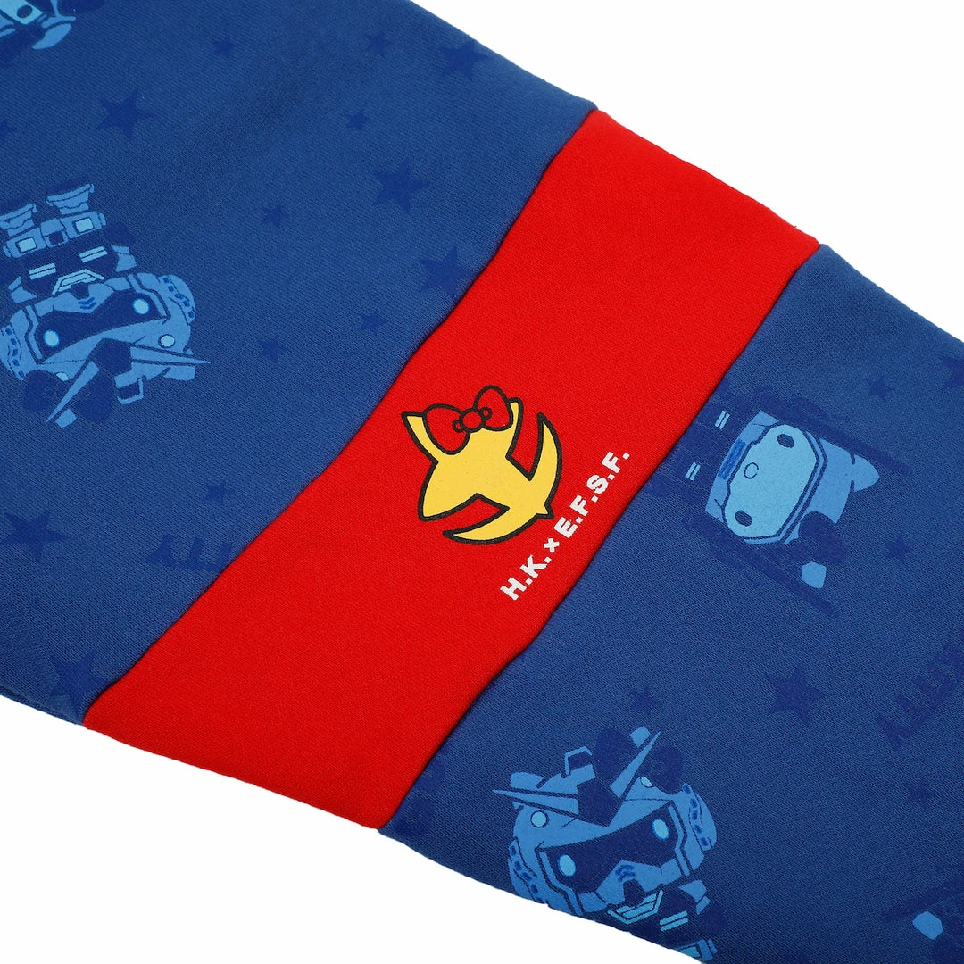 Time to suit up! This colorblocked hoodie features a grey tonal Gundam pattern with contrasting panels of red and blue throughout. There’s a graphic with the Hello Kitty RX-78-2 Gundam at the front with additional mobile suits on the back.