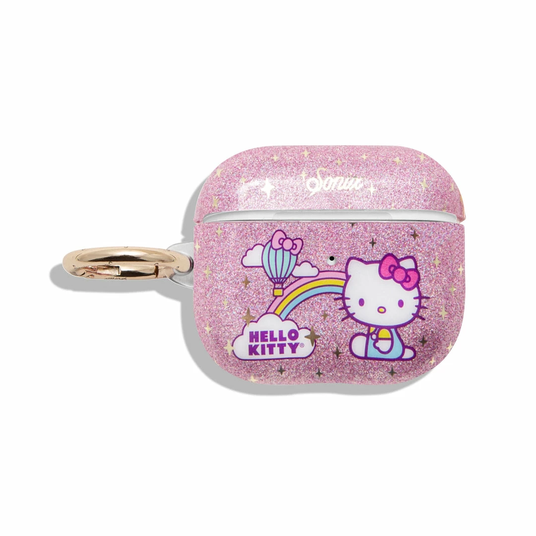 Bring a little sparkle into your life with the Hello KittyĀ RainbowĀ AirPods case. With pinkish-violet glitter, gold foil stars and a rainbow graphic, you’ll shine on day or night!Ā Use the snap hook to attach your case somewhere securely.