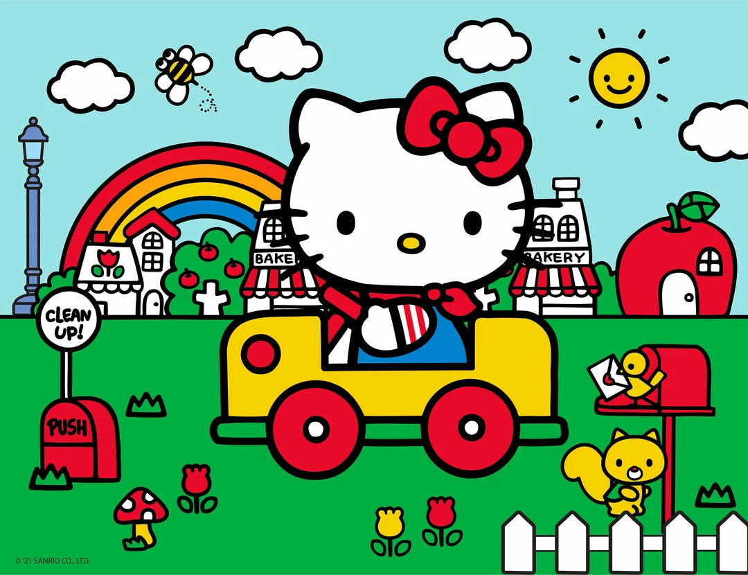 So cute! This 100-piece jigsaw puzzle features Hello Kitty driving an adorable yellow car through town. Full of rich colors and fun details, this puzzle is perfect for a leisurely weekend indoors.