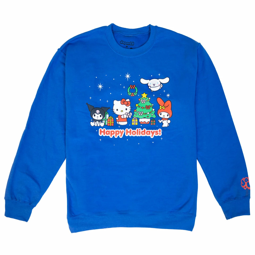 Hello Kitty and Friends want to wish you happy holidays with this royal blue pullover sweatshirt. This graphic has them decorating a tree in the snow.