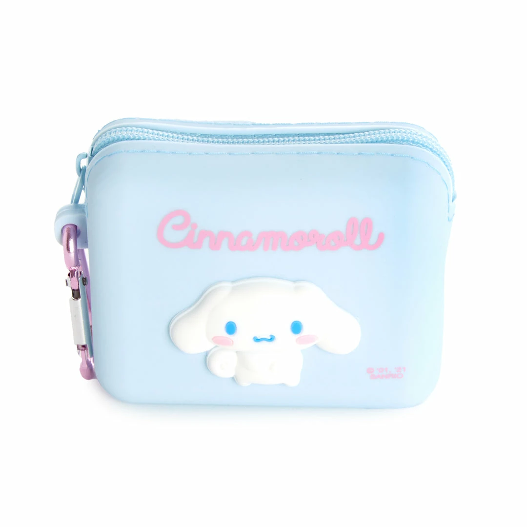 Keep your loose bills, earphones, and more in this handy silicone pouch. It features a die-cut Cinnamoroll applique at the front with a heart-shaped carabiner for easy carrying.