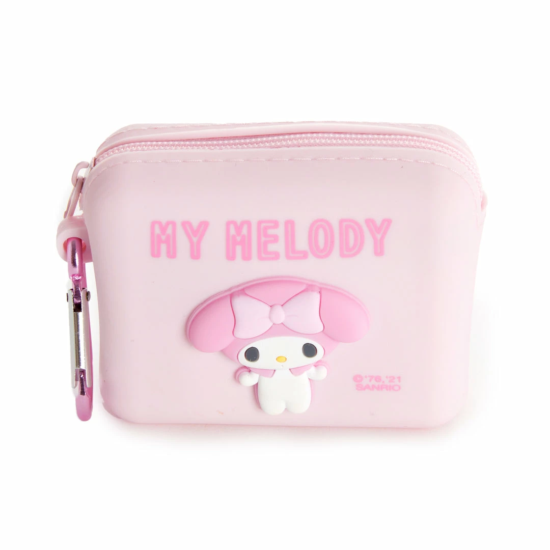 Keep your loose bills, earphones, and more in this handy silicone pouch. It features a die-cut My Melody applique at the front with a heart-shaped carabiner for easy carrying.