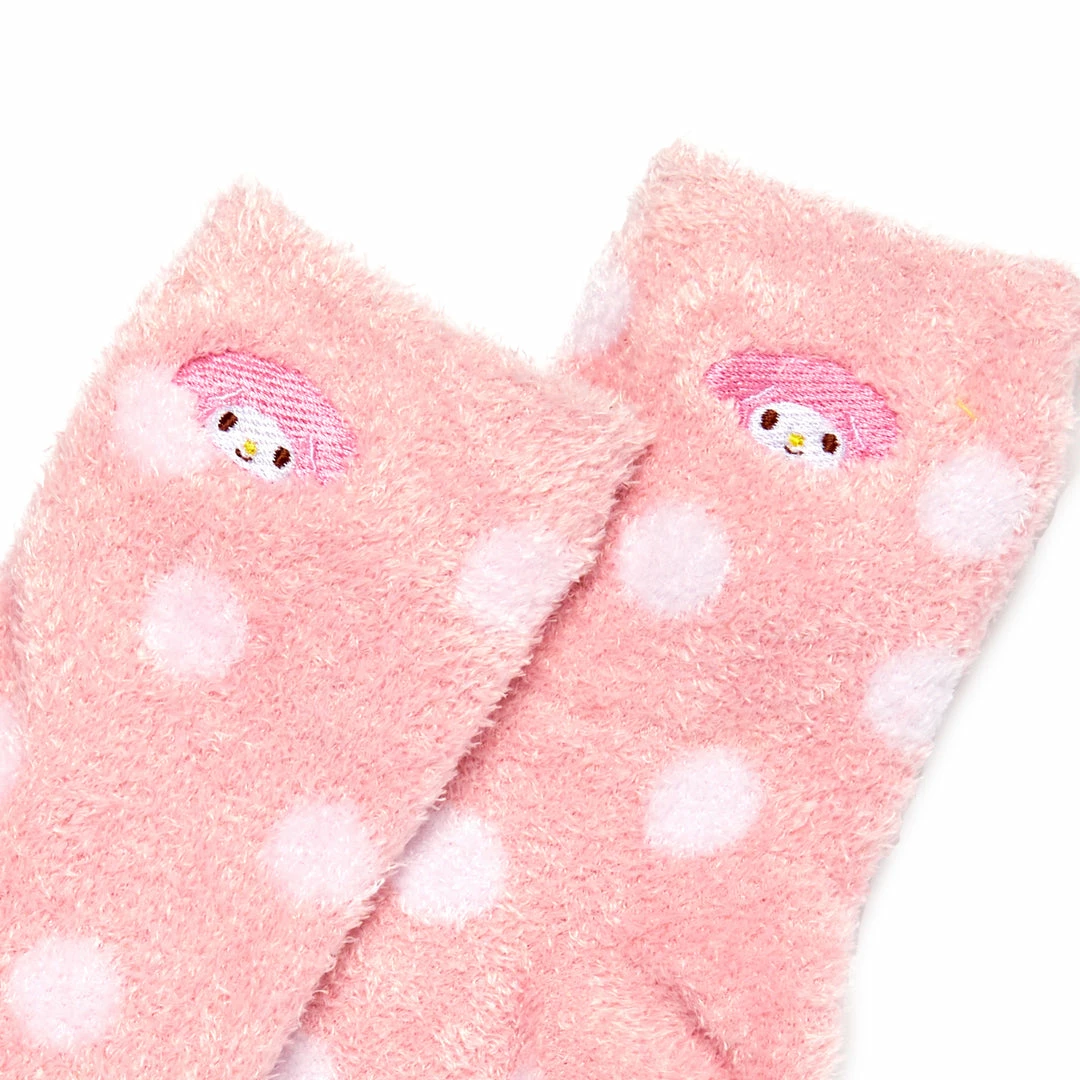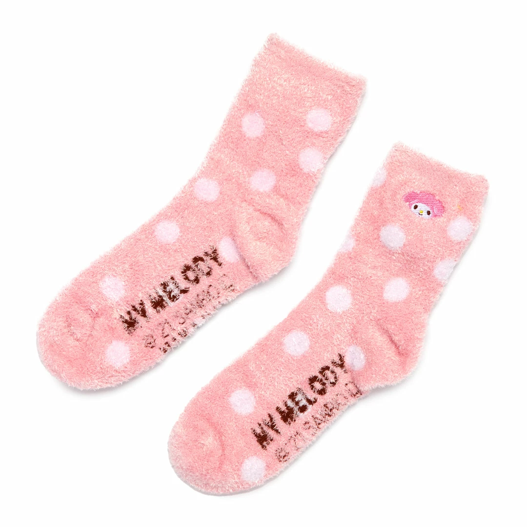 Make yourself comfortable with these cozy fuzzy socks! Perfect for lounging around on weekends-in, they have the cutest spotted pattern finished with your favorite Sanrio character embroidered at the top. Pairs well with hot chocolate and your favorite TV re-runs!