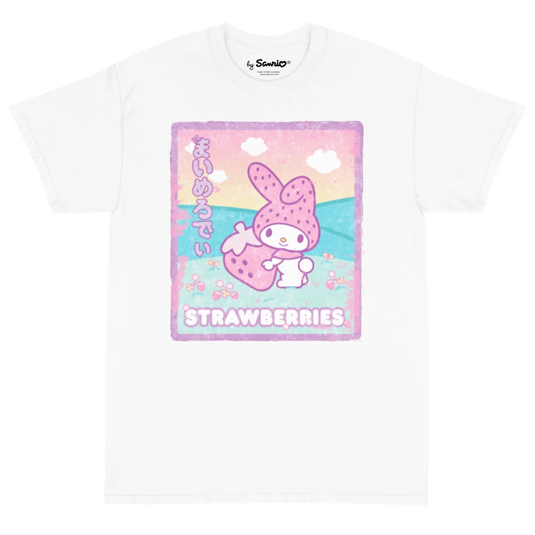Name a cuter drink than strawberry milk! We’ll wait! That soft, creamy pink color is too cute to resist. We ended up creating a small collection of graphic tees that’s just as sweet. This tee features My Melody giving a strawberry a loving hug! The Japanese text spells out, “My Melody” in hiragana.